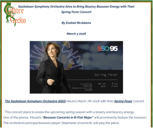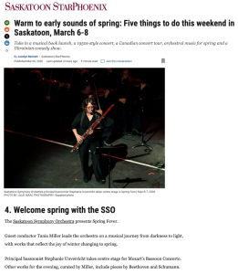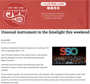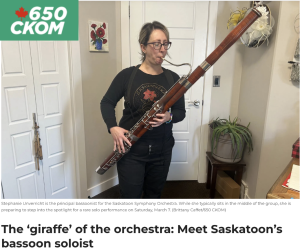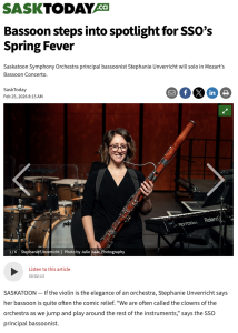 Unverricht and her bassoon will be featured in the Saskatoon Symphony Orchestra’s Spring Fever with a performance of Mozart’s Bassoon Concerto. The piece is bouncy and fun, the perfect way to beckon spring.