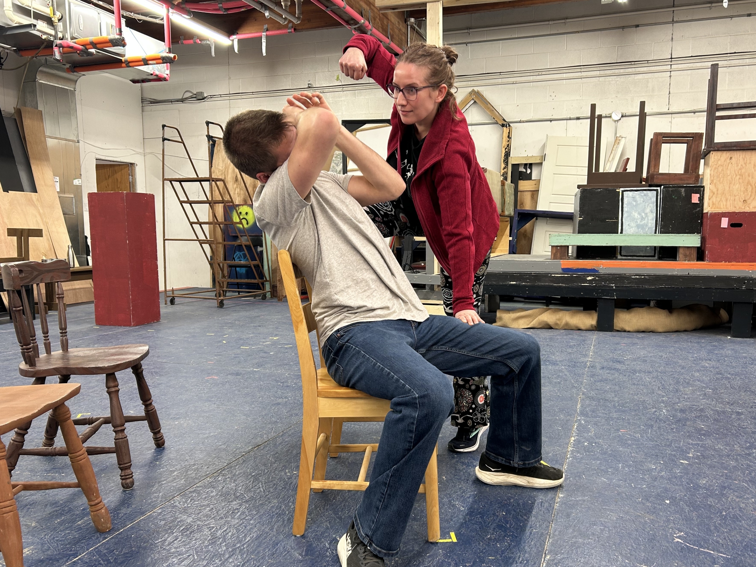 A scene from rehearsal of Luminaire Theatre Works production of Witches!? In Salem?! (Luminaire Theatre Works)